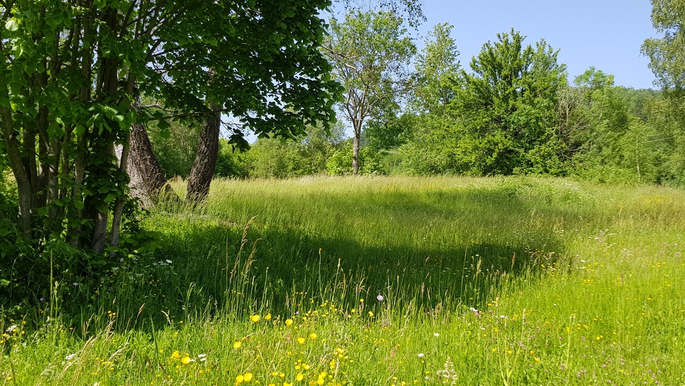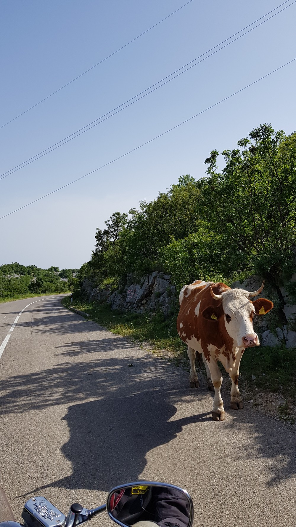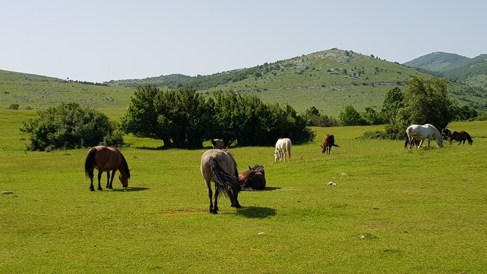 Ništa, nastavljamo dalje. Rudolfina se ravnomjerno spušta i u jednom trenutku šuma nestaje, vozimo se kroz beskrajne livade s rijetkim kržljavim grmljem. Nevjerovatna transformacija! Gledamo konje vrane, po livadama razigrane (oprosti Đorđe, morao sam, sigurno je to i Vasa Ladački tako zamišljao) dok polako zmijugamo prema moru.