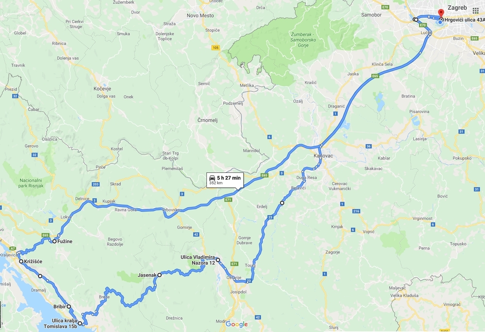 U Hreljinu se priključujemo na Karolinu, drugu povijesnu cestu prema moru kojom idemo sve do Fužina. Na izlazu iz Fužina odlazimo na autocestu koja nas vodi do Zagreba.