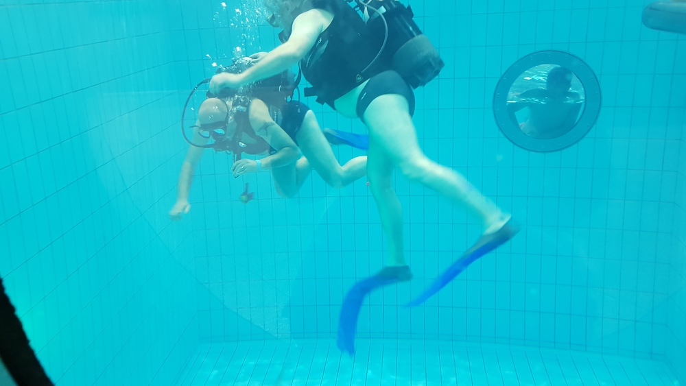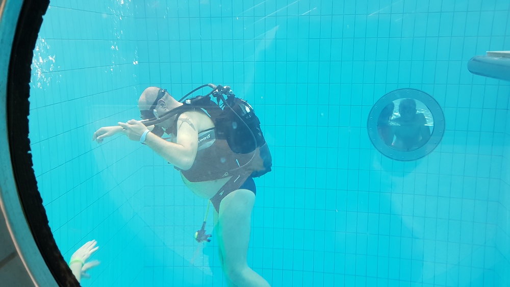 Spuštamo se na dno bazena. Upuhavanjem zraka u Eustahijevu cijev izjednačavam pritisak s vanjske i unutrašnje strane bubnjića. Instruktor mi znakovima daje upute da probam raditi s balastnim prslukom. Treba malo vježbe i idem malo gore, malo dolje. Fantastično.